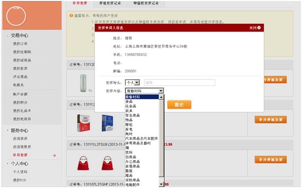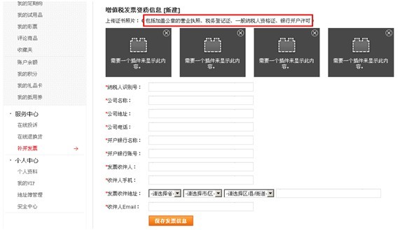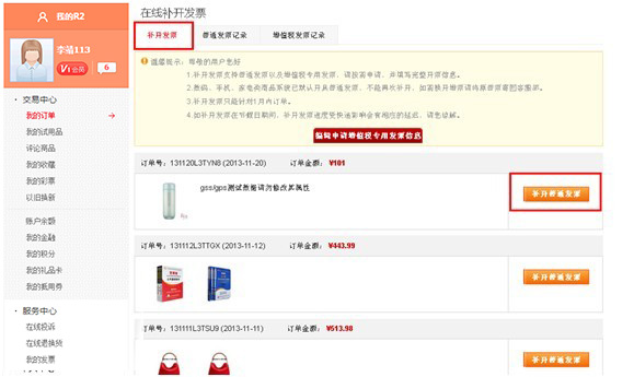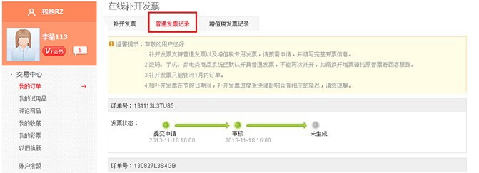 - 在"服务中心—在线补开发票""点击"普通发票记录或者增值税发票记录发票记录"即可查询补开发票的状态。