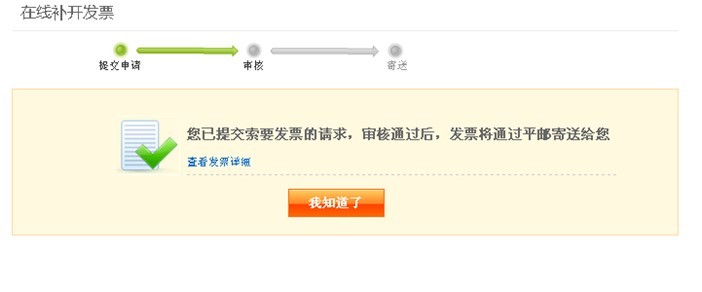 - (3)已成功提交,同时可以查看本次补开发票处理进度。