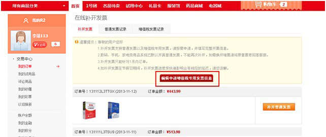 - (1)登录R2采购平台后进入“我的订单—我的发票",点击"编辑申请增值税发票专用发票信息"。